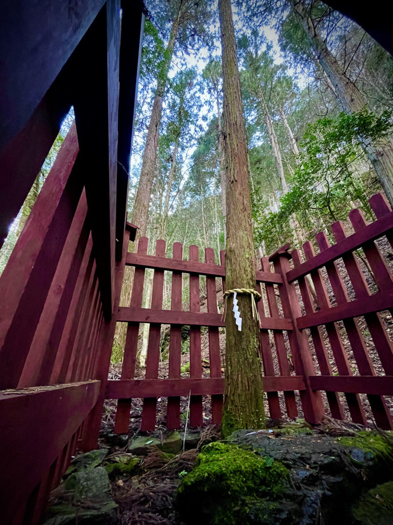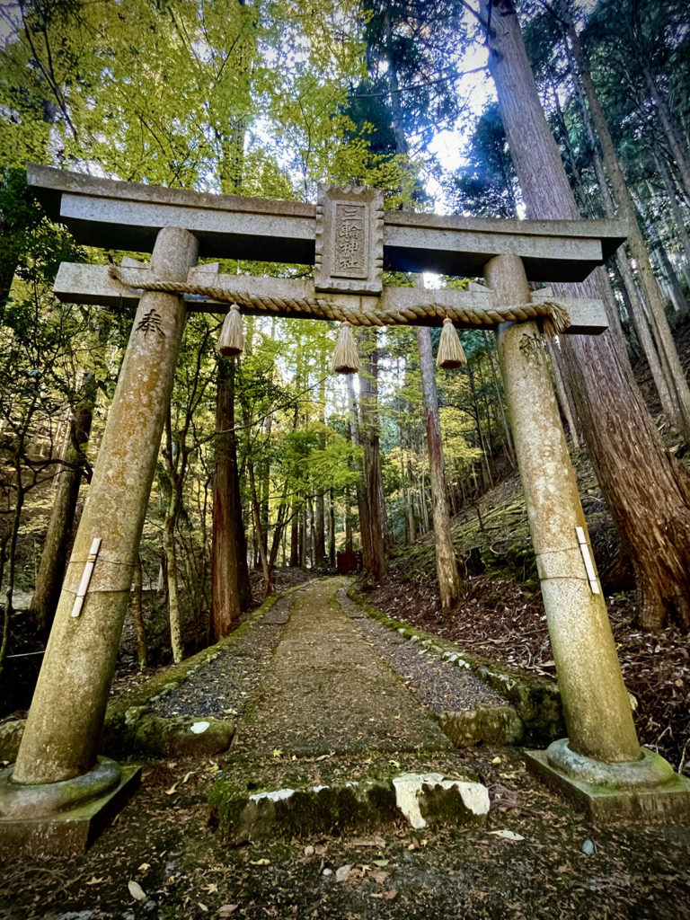 京北の明石にある三輪神社には社殿がなく、宮の谷の山を背にして、木立に囲まれた場所に直径20センチ程の1本の杉の木を御神体として祀り、朱色の玉垣で囲っています。
